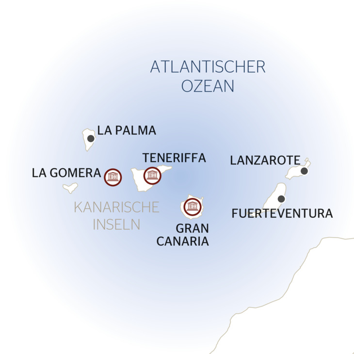 Diese großartige Reise führt Sie zu sechs Inseln mit herrlich mildem Wetter. Entdecken Sie jede Insel und die besonderen Gegebenheiten, die sie auszeichnen. Auf Teneriffa und Gran Canaria entführen blühende Gärten die Besucher in frische, wohlriechende Höhen. Das friedliche La Gomera und La Palma bieten eine dschungelartige, üppige Vegetation. Die grauen, imposanten Klippen auf Lanzarote schließlich unterstreichen die unermessliche, unendliche Schönheit der Inseln. Das einzigartig gestaltete, milde Paradies Fuerteventura entstand vor Millionen von Jahren aus dem Meer. Verpassen Sie nicht den Timanfaya-Nationalpark und die Lavaströme auf den mondähnlichen Feuerbergen.